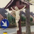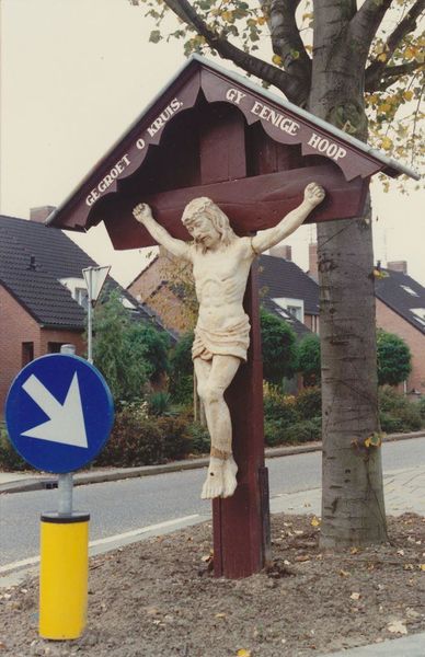 Kruisbeeld oorspronkelijk geplaatst door Janneke Goossens na de val uit een boom van van Hagen. Het corpus is vernieuwd door Kunen. |