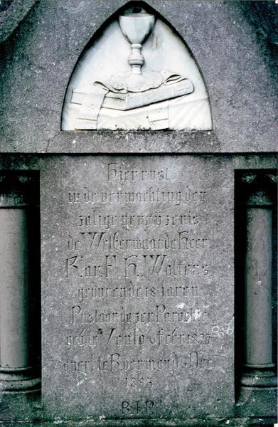 Grafmonument van pastoor Wolters Grafmonument: Stele uit hardsteen. Graf nummer E3. Karel Frans Hubert Wolters * 6-2-1827 te VenIo; + 6-12-1893 te Roermond. Pastoor te Reuver vanaf 1872 tot okt. 1893. Priester gewijd 1853. Kapelaan te Lottum |