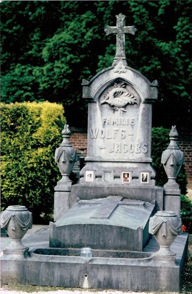 Grafmonument van de familie Wolfs-Jacobs Grafmonument: Hardstenen stele. Volgens inscriptie gemaakt door fa Wergifosse te Robermont bij Luik. Graf nummer C209-210. Familiegraf Ludovicus Wolfs Wolfs-Jacobs. * 27-12-1860 in Eysden; + 22-11-1925 Elisabeth Wolfs-Jacobs * 18-2-1867 in Eysden; + Louis Wolfs was hoofd van de openbare jongensschool. Leraar aan de kweekschool. President van de philharmonie. Voorzitter van het Kruisverbond en bestuurslid van de St. Lambertusvereniging. |