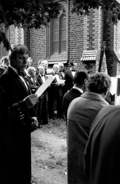 St. Lambertusprocessie Het zingen van het aloude St.Lambertuslied hier door het mannenkoor |
