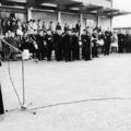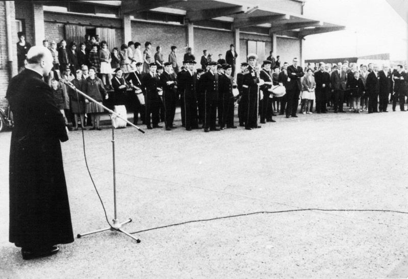 Toespraak van Pater Weiss tijdens de inzamelingsactie voor de bouw van de Fatimakerk in Offenbeek. Het fluiterkorps en het tambour-maître korps staan op de achtergrond. Pater Weiss was de eerste rector van de Fatimakerk in offenbeek. Links staat Toos Ickenroth en haar vriendin Annie Smeets (mevr. Slabbers). |