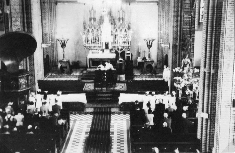 Pater Jose Goertz (in het midden) op weg naar zijn eerste heilige mis. Rechts Pastoor P.v.d. Broek Op de achtergrond drogisterij v.Gassel - Goossens en het oud patronaat |