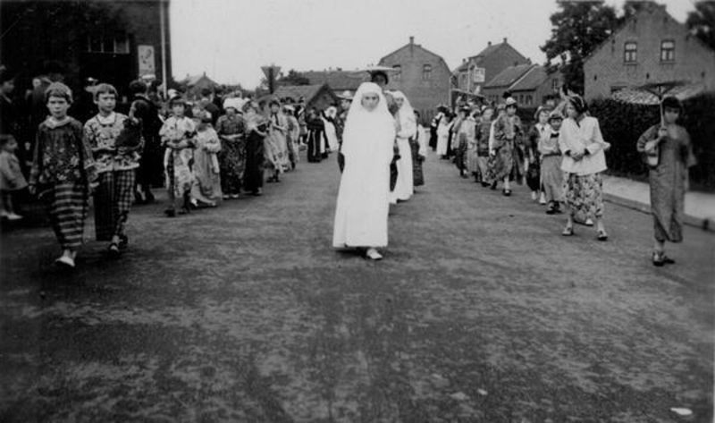 Kindsheidsoptocht. Links achter het brandweerhuisje naast de winkel van Hannes Gommans. Vanaf het begin van de 20e eeuw, maar vooral vóór de Tweede Wereldoorlog werden er in veel plaatsen (jaarlijkse) optochten georganiseerd, waarin de kinderen verkleed al missionaris, missiezuster, neger, Chinees of indiaan meeliepen. |