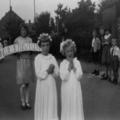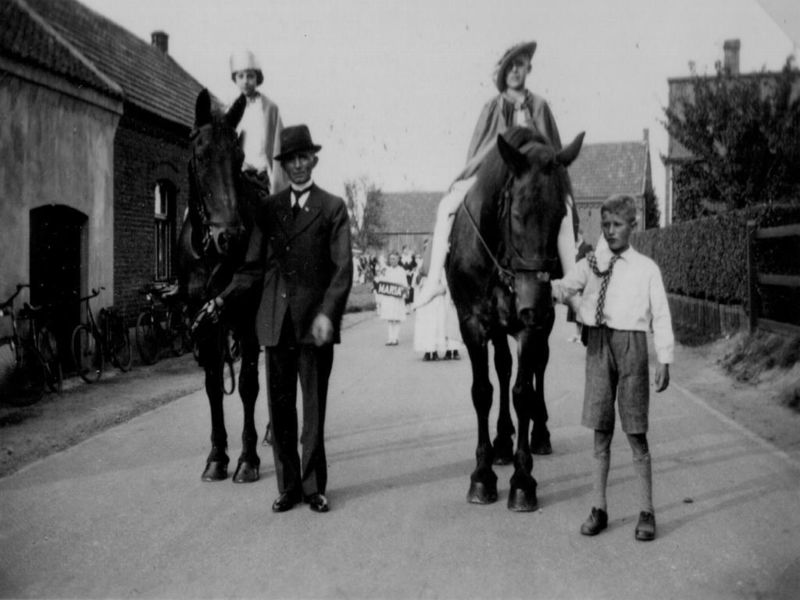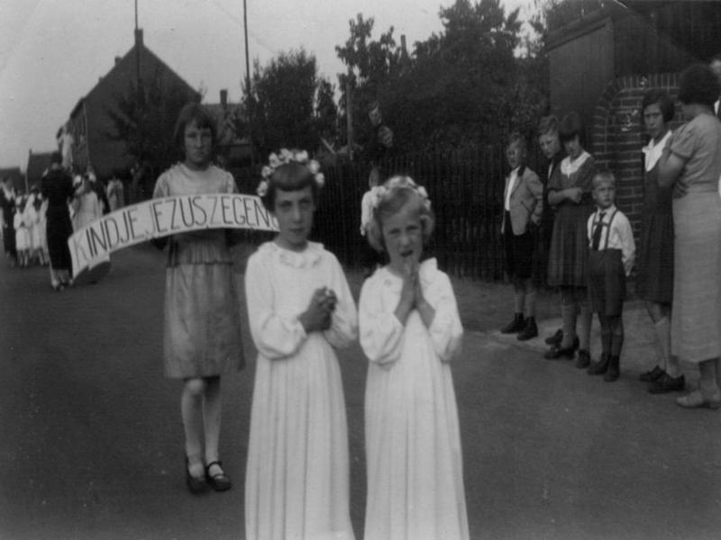De Kindsheidsoptocht met links Mia Bosmans en rechts Jose Bosmans. Vanaf het begin van de 20e eeuw, maar vooral vóór de Tweede Wereldoorlog werden er in veel plaatsen (jaarlijkse) optochten georganiseerd, waarin de kinderen verkleed al missionaris, missiezuster, neger, Chinees of indiaan meeliepen. |