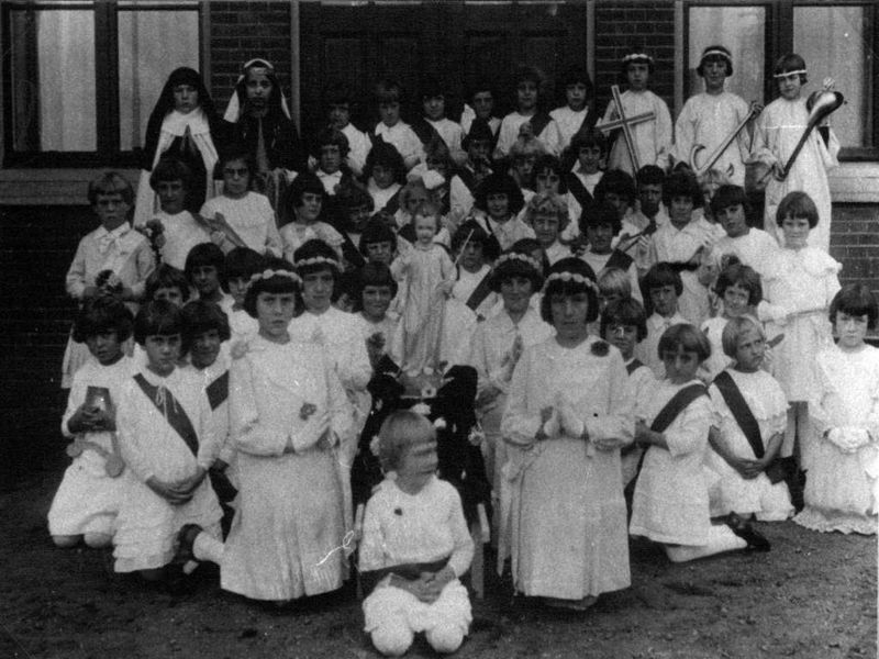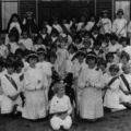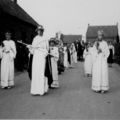 Kindsheidsoptocht bij het klooster in Reuver. Vanaf het begin van de 20ste eeuw, maar vooral vóór de Tweede Wereldoorlog, werden er in veel plaatsen (jaarlijkse) optochten georganiseerd, waarin de kinderen verkleed al missionaris, missiezuster, neger, Chinees of indiaan meeliepen. |