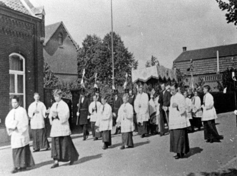Kerk en religie | Processie in Reuver met op de achtergrond de St. Lambertusschool | Pastoor Vranckenlaan 26 | Reuver | 1934 | ||||