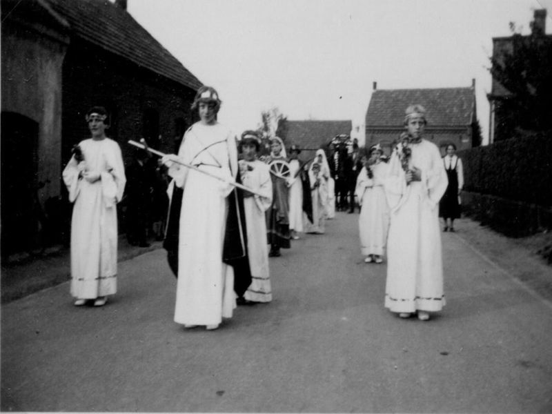 Kindsheidoptocht. Voorop Mie Augustus, Mie Beurskens en El Janssen. Vanaf het begin van de 20e eeuw, maar vooral vóór de Tweede Wereldoorlog werden er in veel plaatsen (jaarlijkse) optochten georganiseerd, waarin de kinderen verkleed al missionaris, missiezuster, neger, Chinees of indiaan meeliepen. |