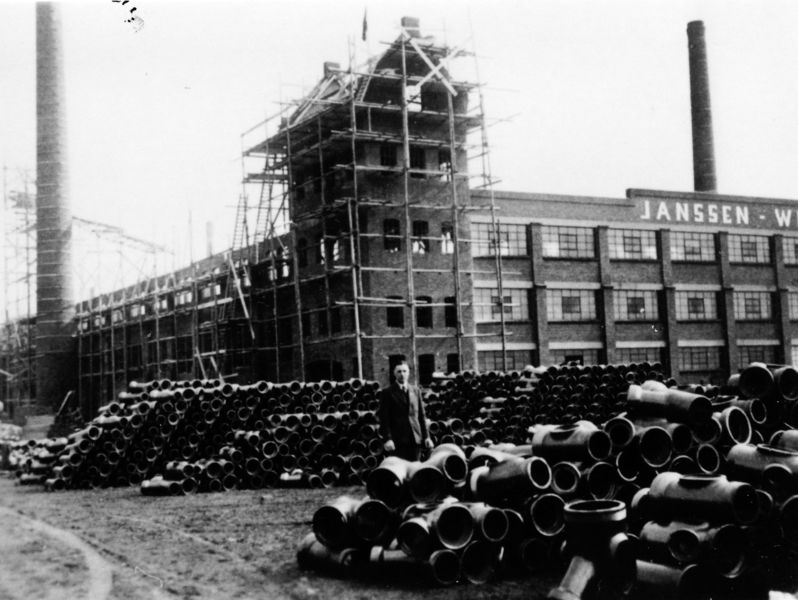 Fabrieken / Bedrijven | Gresbuizenfabriek Janssen-Willemsen in opbouw, met op de voorgrond directeur Rein Janssen. | Greswarenstraat 3 | Offenbeek | 1941 | ||||