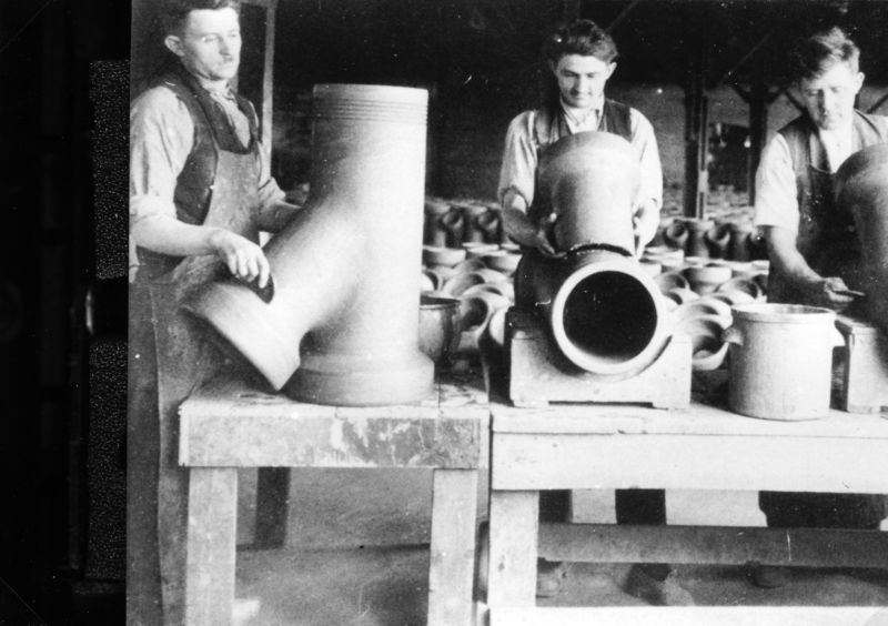 Fabriek Janssen-Willemsen V.l.n.r.: Piet van Tegelen, Piet Schouren en Lei Lennaerts (van de veldwachter) bij het maken/afwerken hulpstukken. |