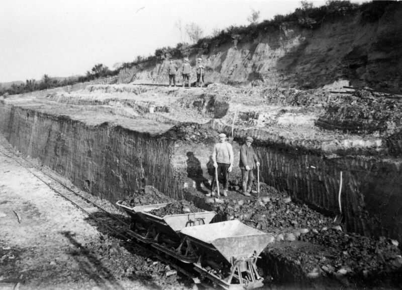 Het steken van de klei in het Duitse Grenswald (Diergardt). Links: voorman Fried Killaars, rechts: Joën Dorssers.De foto is genomen in de kleigroeve van Janssen-Willemsen in Diergardt. De kleigroeve werd gepacht van de Johannes Freiherr von Diergardtschen Verwaltung in Keulen. |