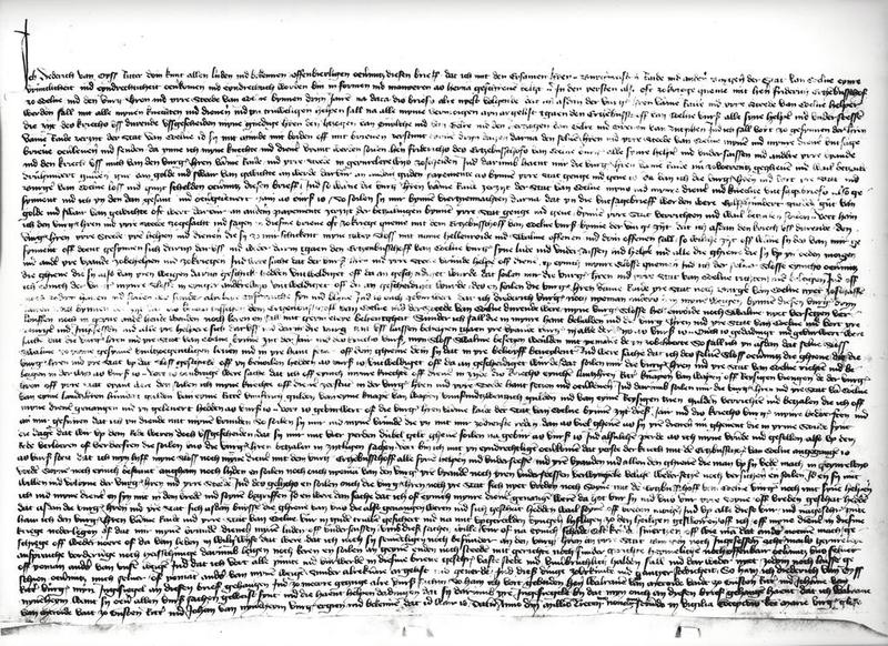 Charter van 7 Dec 1392 Ridder Dirk v. Oest , Heer van Hillenrade en Swalmen, sluit met de stad Keulen een verbond en ontvangt daarvoor dadelijk 300 goudgulden etc. |
