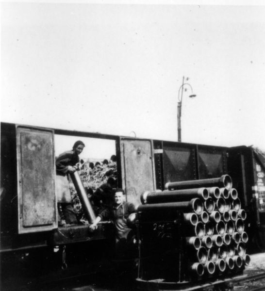 Fabrieken / Bedrijven | Buizen laden bij de fabriek van Janssen-Willemsen. Links in wagon: Jan van de Ven en rechts Jan Teeuwen.. | Greswarenstraat 3 | Offenbeek | |||||