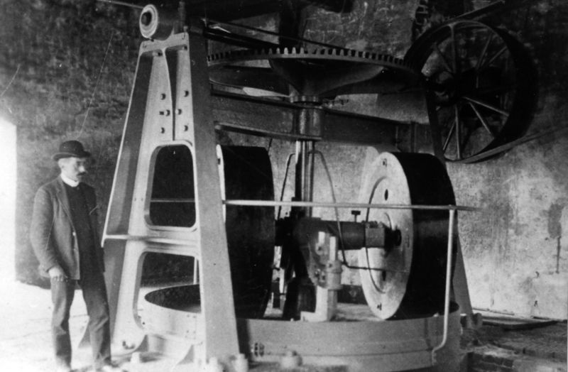 Fabriek Janssen-Willemsen: Jos Janssen, stichter van het bedrijf, bij de nieuwe kollergang. Hierin wordt de klei geplet. Vanuit de kollergang ging de klei naar de strengpers. Links Jos Janssen. |