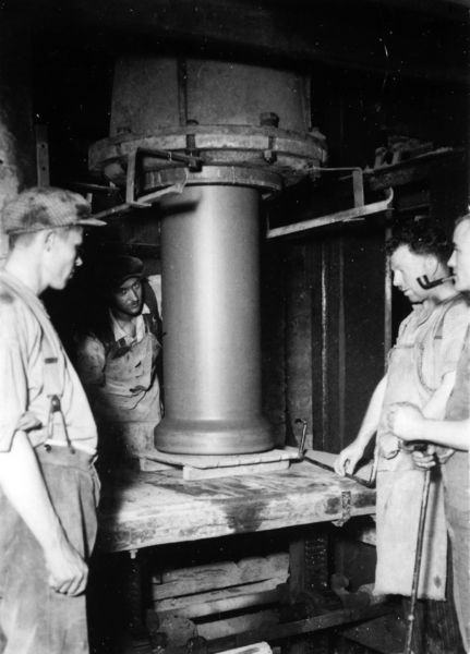 De walspers in de dertiger jaren. Greswarenfabriek Janssen-Willemsen. Rechts, met draagijzer, Michel Boerenkamp. Achter de pers Frits Smeets |