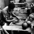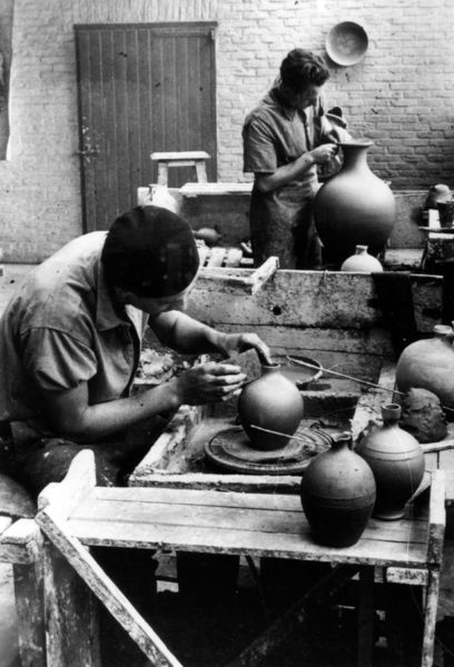 Twee keramiekdraaiers in 1946 aan het werk bij St. Joris in Beesel. Op de achtergrond : Lambert Driessen en op voorgrond Louis Thijssen, die later Loré samen met René Peeters oprichtte. |