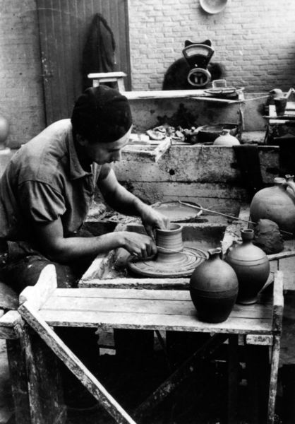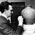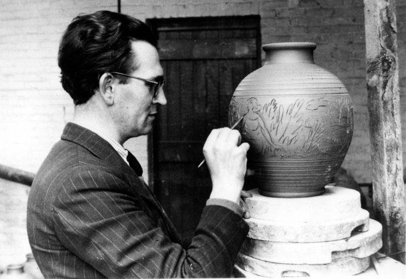 Louis Thijssen aan het werk bij St. Joris. Hij is medeoprichter van het keramiek bedrijf Loré. Loré werd in 1953 opgericht door Louis Thijssen en René Peeters vandaar de naam. |