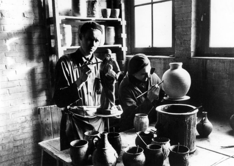 Fabrieken / Bedrijven | Mat Boesen met het decoreren van een vaas bij St. Joris . | Sint Jorisstraat 54 | Beesel | 1946 | ||||