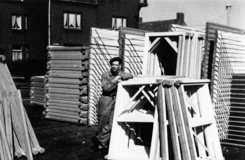 Piet Janssen (van Bérkens Nuize) aan het werk bij Lennaerts aannemer/timmerbedrijf. |