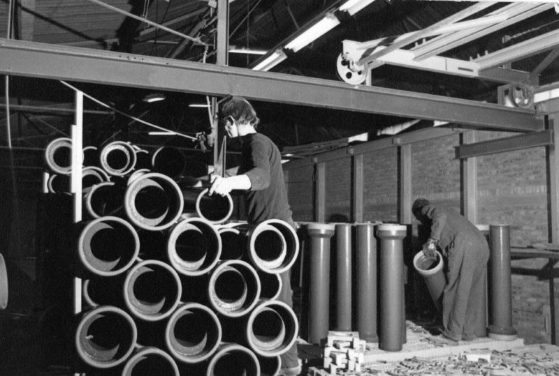 Fabrieken / Bedrijven | Greswarenfabriek Teeuwen. De buizen welke uit de oven komen worden op pallets gestapeld. | Keulseweg 36 | Offenbeek | 1974 | ||||