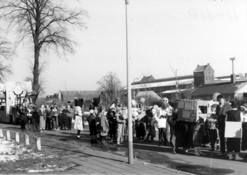 Carnaval | Opstelling carnavalsoptocht voor de greswarenfabriek van Janssen-Willemsen. | Wilhelminalaan 54 | Reuver | 1985 | ||||