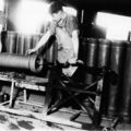 Greswarenfabriek Janssen-Willemsen: Hens Weyers snijdt de buis op het walsapparaat op de juiste lengte af en brengt de rillen aan met een krets. Kueb Weyers , rechts, werkt de buis met een rubber dichtring af. Geheel links Naad van Wylick. |