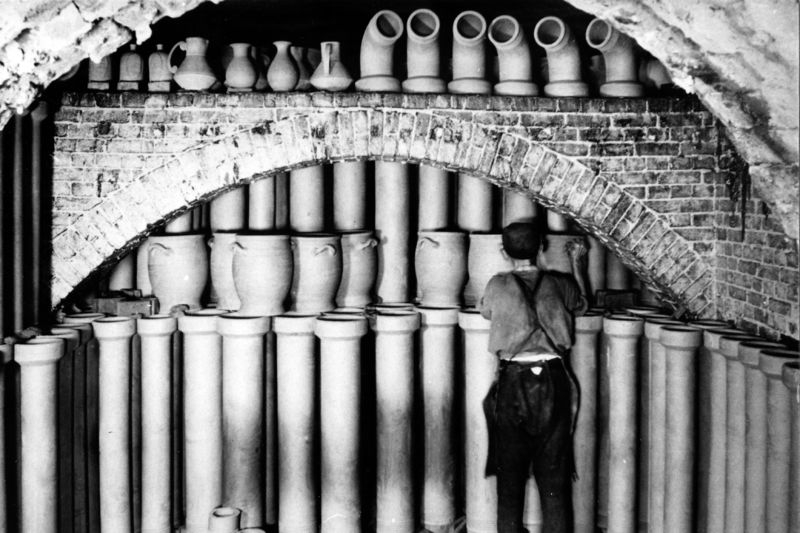 Fabrieken / Bedrijven | Sjaak Geelen bezig de buizen, hulpstukken en kruiken te "zetten". Grofkeramische fabriek Laumans. | Keulseweg 86 | Offenbeek | 1946 | ||||