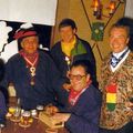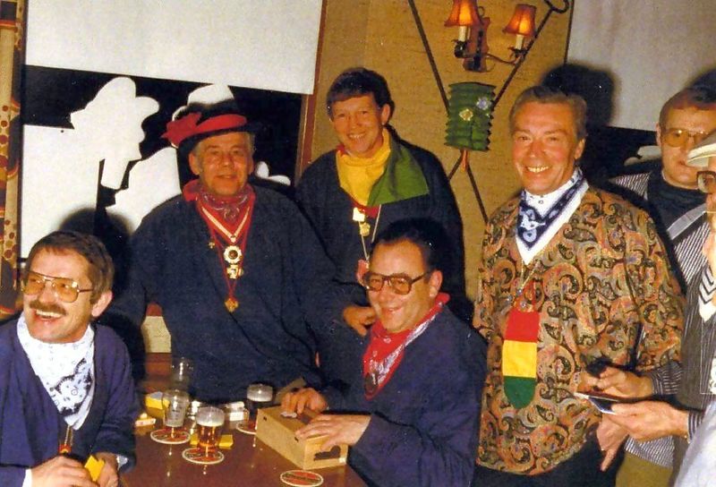 Boerenbal 1982. Vanaf 1982 werd elk jaar het boerenbal georganiseerd om de kas te versterken. We zien hier de bestuursleden Piet de Vlieger, Paul Thijssen, George Paquay, president Louis Heinen en de penningmeester Jan Eggels, die de geldkist stevig vasthoudt. |