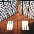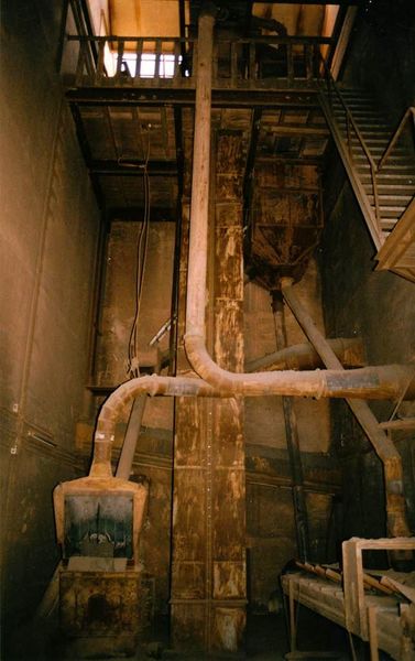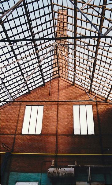 Voormalige gresbuizen- en tegelfabriek Janssen-Dings kort voor de sloop. Zicht vanuit hal op schoorsteen in de noordgevel. |