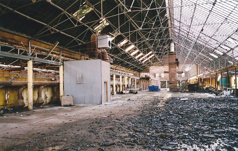 Fabrieken / Bedrijven | Voormalige gresbuizen- en tegelfabriek van Janssen-Dings kort voor de sloop. Zicht van binnen richting noorden. | Industriestraat 43 | Belfeld | 1999 | ||||