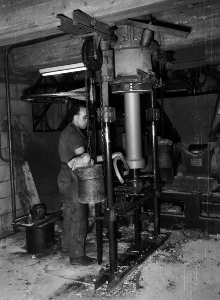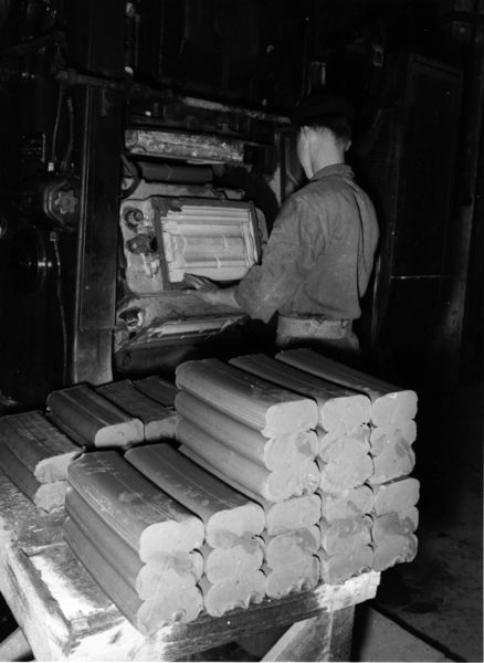 Fabrieken / Bedrijven | Lei Knops aan de buizenpers in de gresbuizenfabriek van Janssen-Dings in Belfeld. | Industriestraat 43 | Belfeld | 1957 | ||||