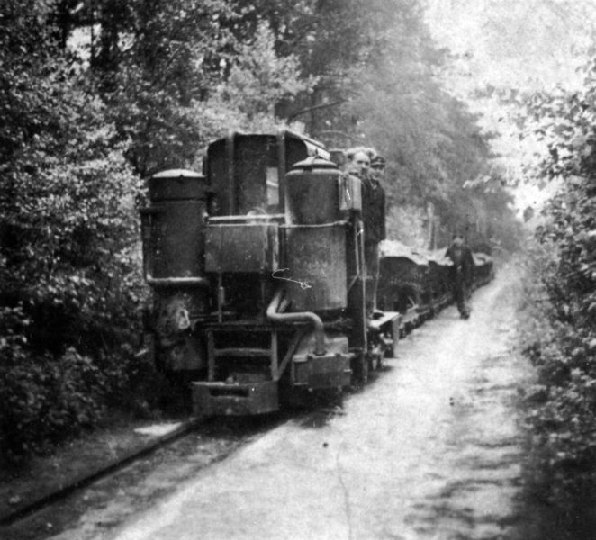 De eerste smalspoorlocomotief van Janssen-Dings tijdens de oorlogsjaren met houtgasgenerator. Foto vermoedelijk ter hoogte van onverharde bosweg in de richting van de Koelesweg genomen. |