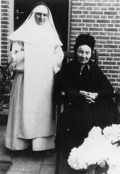 Zuster Maria Alvarez, Elisabeth van Rooijen, de eerste Groene Kruiszuster in Reuver. Zij behandelde patiënten in het klooster. Naast haar Mieke Beurskens-Luttels uit het Gerardusstraatje (laatste woning rechts), die haar laatste jaren doorbracht in St. Jozef, het gedeelte van het klooster voor ouden van dagen. |