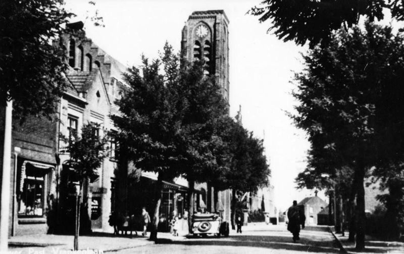 Past. Vranckenlaan links Goossens (Stokse Sjrake) schilder en Sef Cremers, café met veranda. De kerk heeft een stuk geschoten toren, die in 1956 is hersteld. |