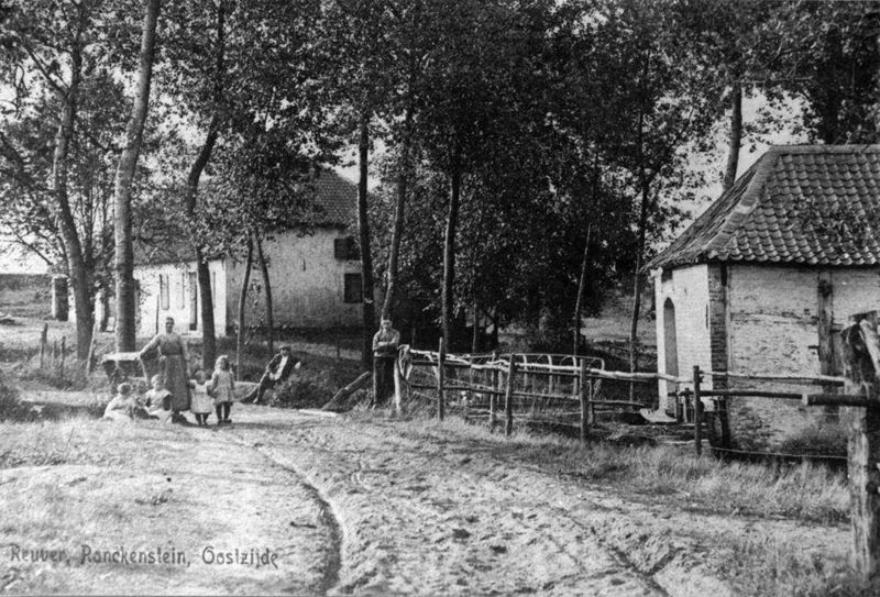Buurtschap Ronkenstein oostzijde. Links mvr. Hendriks, zittend Theunissen Bèr (schoonzoon van de fotograaf) en Smits. |