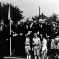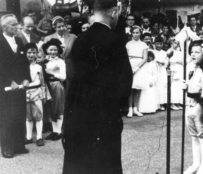 Toespraak door een herder met de herdersstaf van pastoor Van de Broek. Links Herm Litjens, processiecommissaris. Hij zorgde ervoor dat alles goed verliep. Naast hem Juffr. Johanna Hensen. |