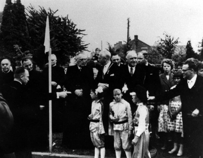 Kerk en religie | Aanwijzingen voor de herdertjes. Links de pastoor van Beesel, pastoor Van de Broek, pastoor-deken G. Stoot van Tegelen, burg. J. Claessen, Wethouder Sjeng Steeghs en Lei Peeters, lid van het kerkbestuur. | Karel Doormanlaan 2 | Reuver | |||||