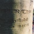 Ingekraste naam op beukenboom in de tuin van het Theresiaklooster in Belfeld. 'P. Pronk' (Piet Pronk was de vroegere tuinier van het klooster) 'Sei gelobt Jesu Her'. |