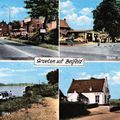 Prentbriefkaart met foto's van de loswal met parlevinker aan de Maasstraat, de markt met gemeentehuis, Rijksweg en Café Maaszicht. |