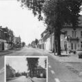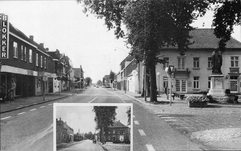 Het Raadhuisplein met rondom de winkels en op de achtergrond de Sint Lambertuskerk. Inzet: Sint Lambertuskerk met stompe toren +/- 1955. |