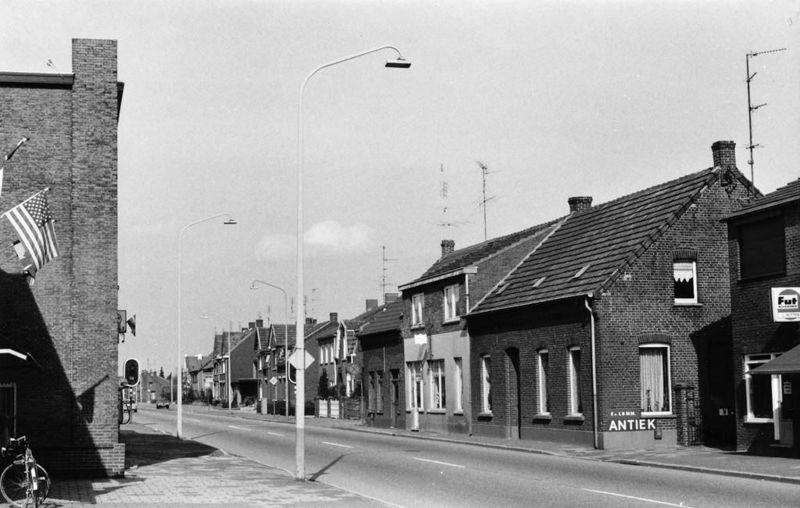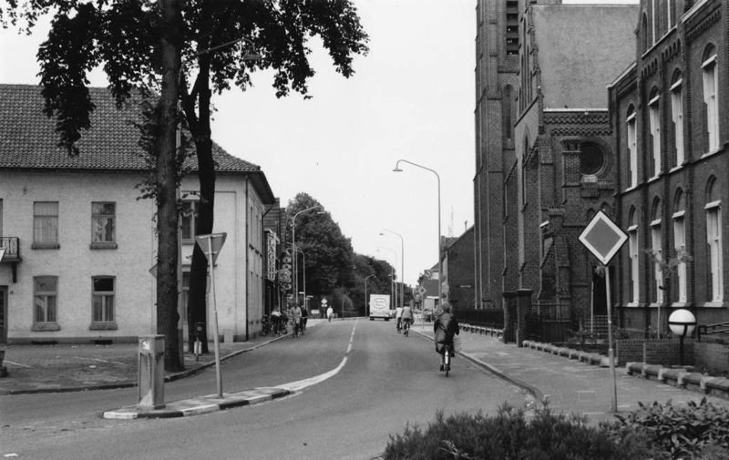 Pastoor Vranckenlaan met links het voormalige gemeentehuis en rechts het voormalige H. Hartklooster met daarachter de kerk. |