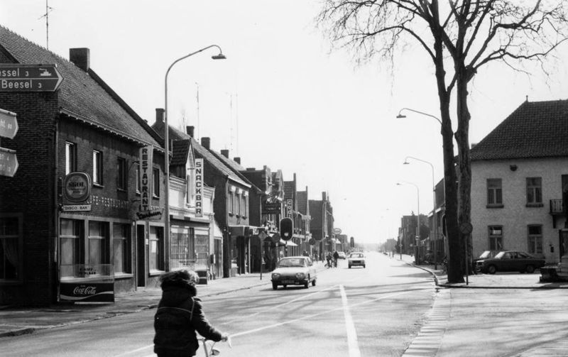 Een doorkijk door het centrum van Reuver richting Roermond. Links café-restaurant 't Centrum. |