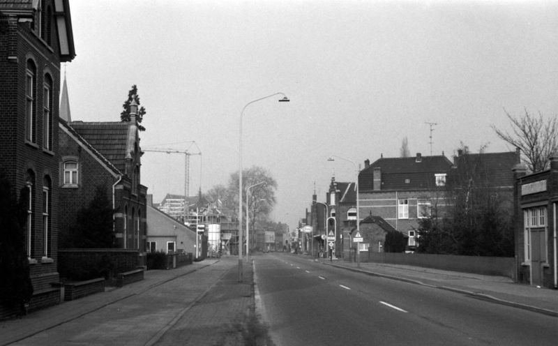 Reuver vanaf de spoorwegovergang met rechts de woning van fabrikant Trienekens aan de Stationstraat gelegen. Let ook op de bouwkraan bij de markt. |