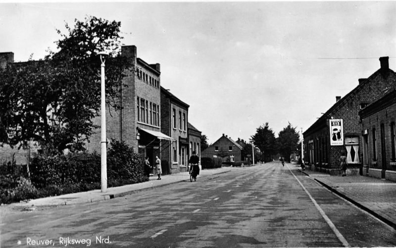 Rijksweg noord ter hoogte van garage Feijts. Links de bazaar van de familie Beerends (Frederik Fluweel), daarnaast bakkerij Beerends, nu fietsenzaak Gommans.. Rechts de antiquair Frits van Lomm. |