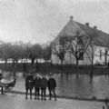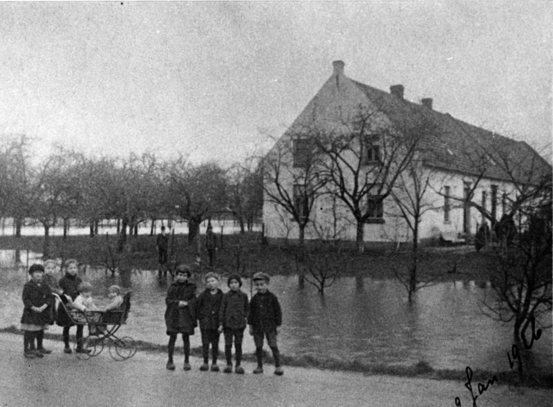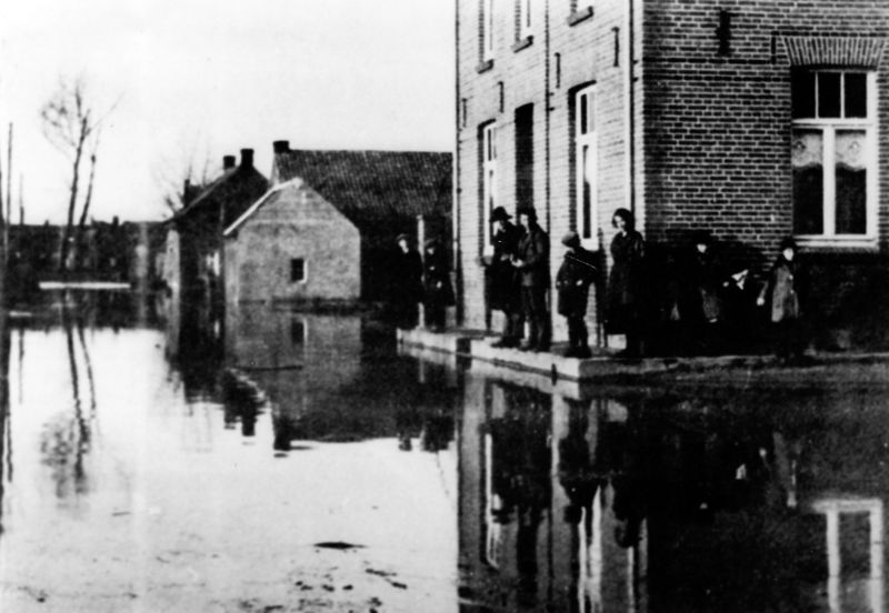 Overstroming bij boerderij Beeckerhof. v.l.n.r.: 1 Corry Kok, 2 + 3 Leentje en Maria Kuypers, 4+5 tweeling Fien en Jeanne Kuypers, 6 Martha Ramakers, 7 Wiel Kuypers, 8 + i9 Lambert Ramakers en Casper op de Camp. Aan de overkant eigenaar Willem Ramakers en Sieper Sefke Hendricks. |