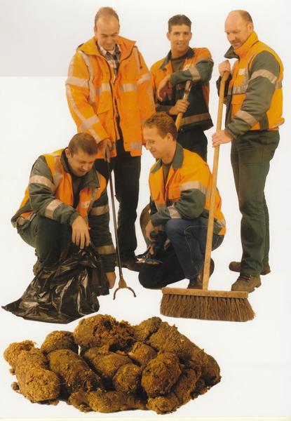 Gemeentepersoneel bij de invoering hondenpoepbakjes. G. Tielemans, J. Selen, J. Colberts, E. Jacobs, P. de Vlieger. |