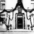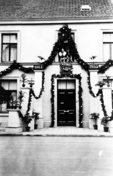 De woning van Lambert v.d. Velden en Elise - Marie Hanouille was versierd ter gelegenheid van hun gouden huwelijksfeest. In de woning was ook de brouwerij Victori gevestigd waar Lambert de eigenaar van was. De halve markt was in bezit van de familie v..d. Velden. |