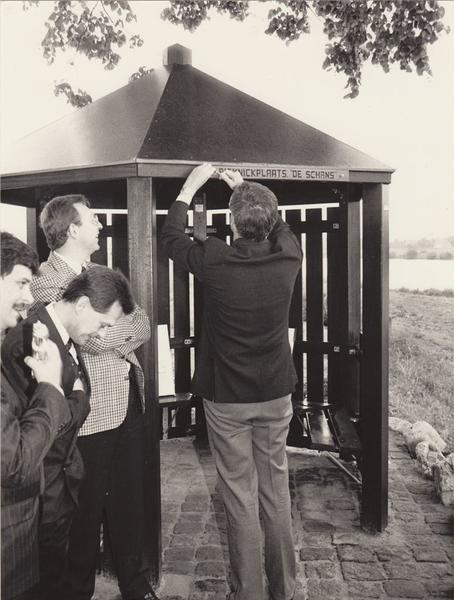 Opening picknickplaats aan het veer door burg. Nuytens. Met gebogen hoofd dhr. Stevens van de Rabobank. |
