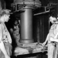 Het persen van gresbuizen bij Janssen-Willemsen. Rechts: Wiel Boerenkamp (met draagijzer). |