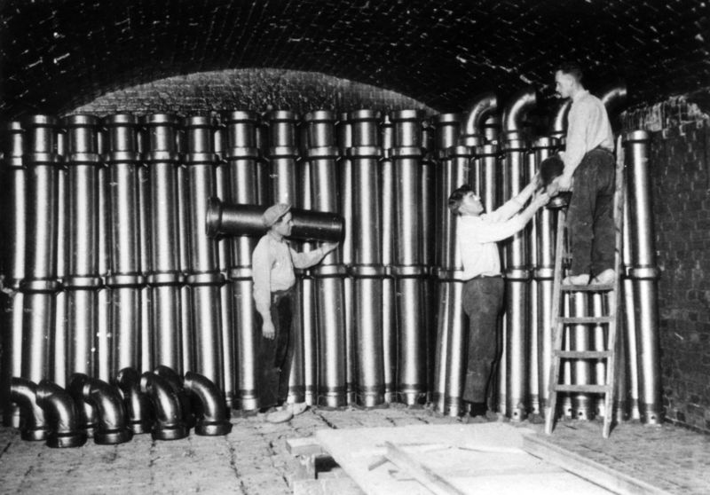 Greswarenfabriek Janssen-Willemsen. Leegruimen oven met gresbuizen. V.l.n.r. Baer Janssen (Hoeb van Nuize) met buis op de schouder, Joep Massop en Jeu v.d.Velden (van Frens). |