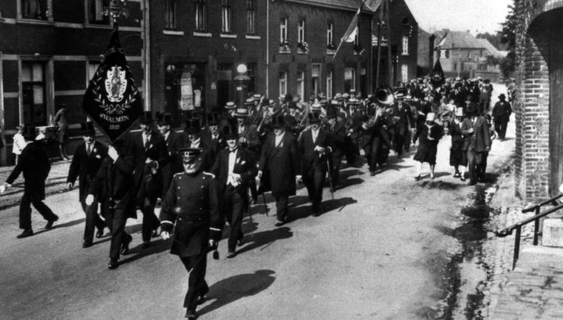 Foto gemaakt t.g.v. het 75-jarig bestaan van harmonie St. Cecilia in Swalmen in juli 1927. Voorop aan weerszijden van het vaandel, de Burgemeester van Swalmen, de achtbare heer Charles Strous en Graaf Wolff Metternich van Hillenraadt. |